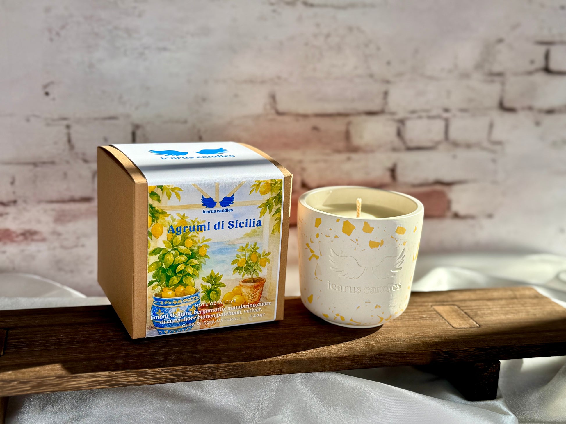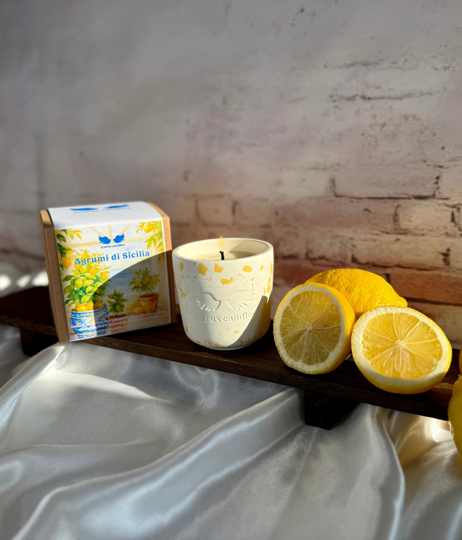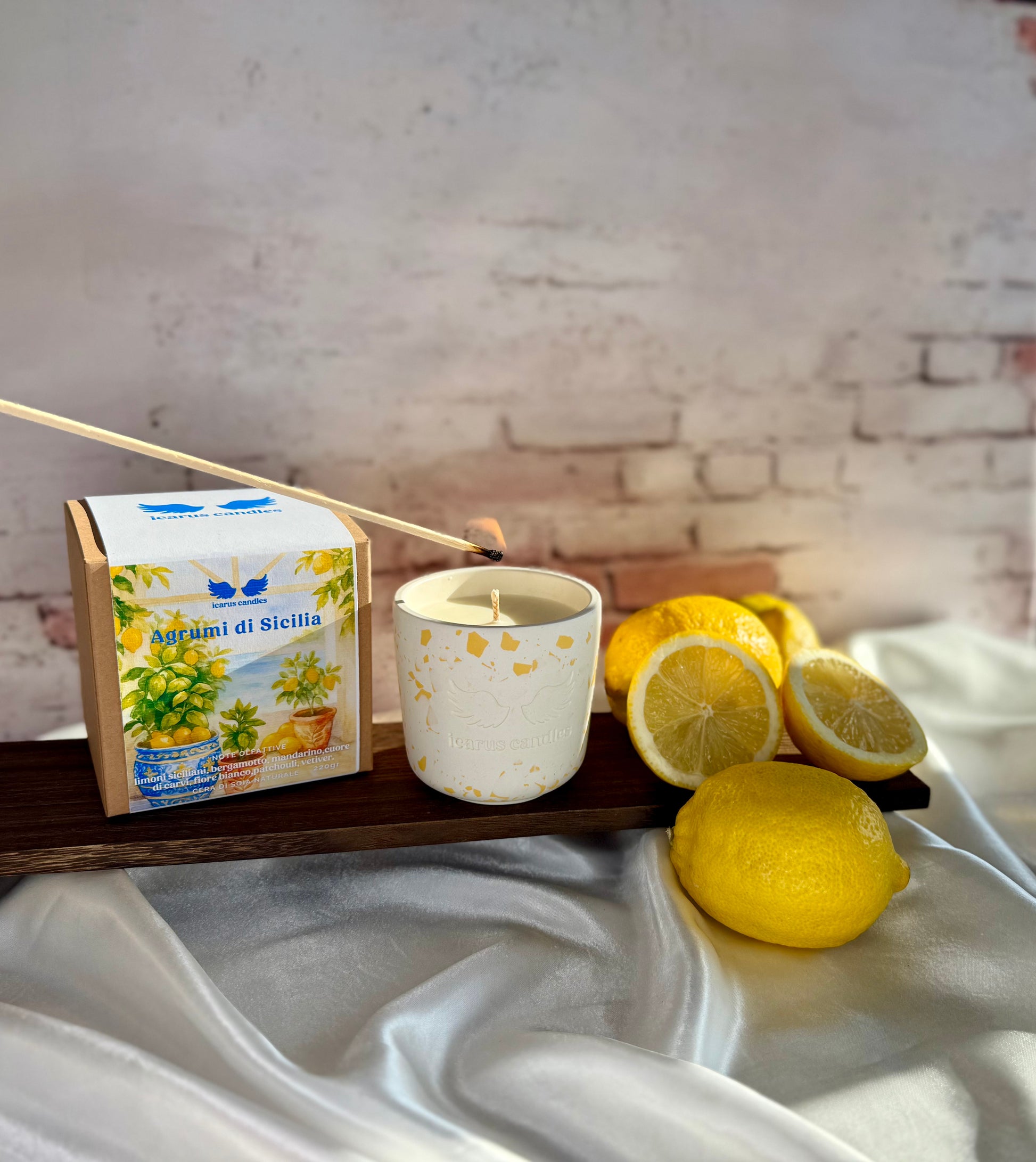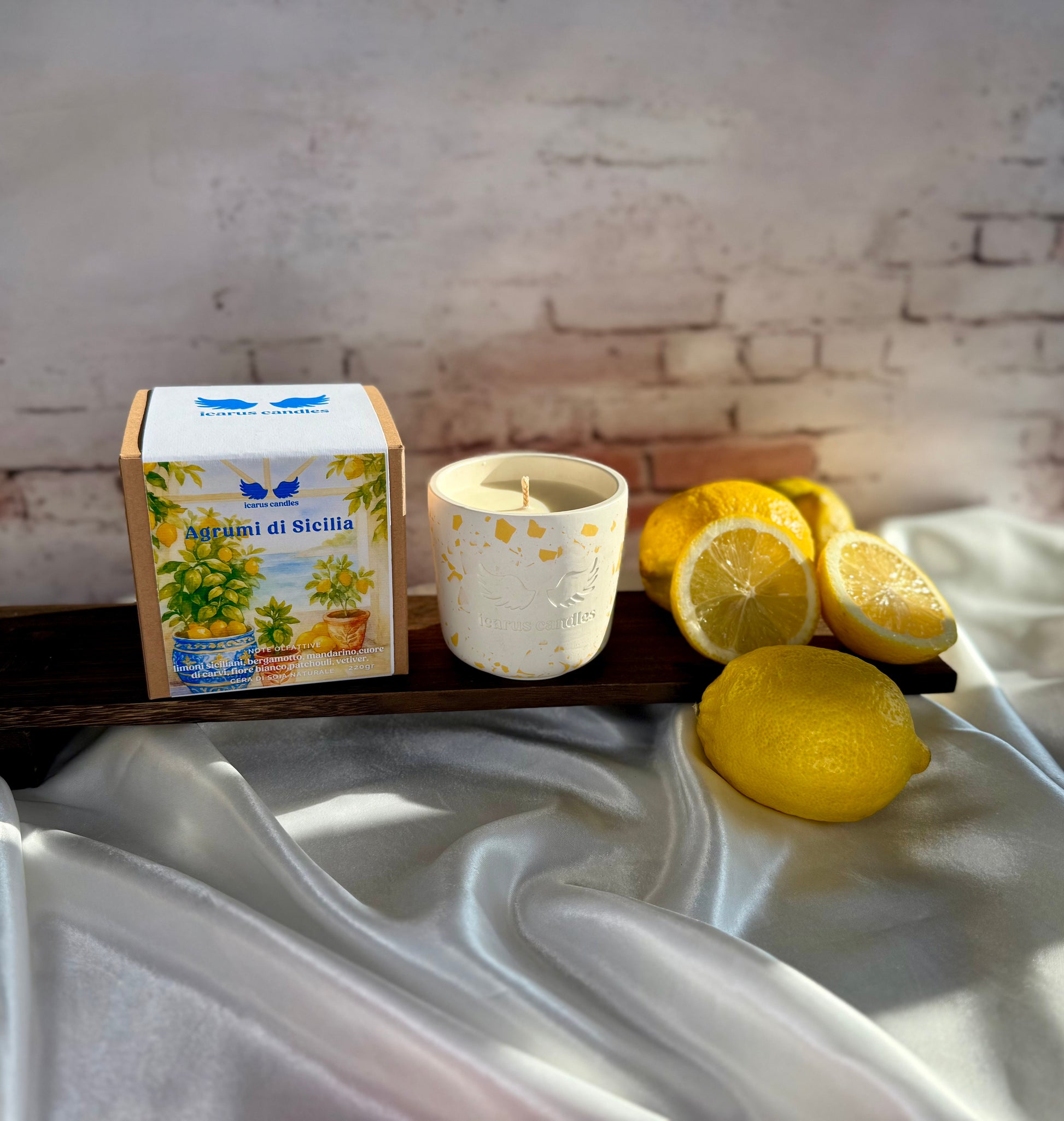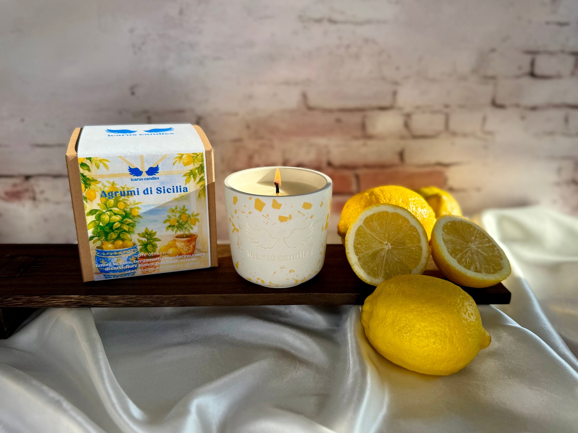 Accendi la candela "Agrumi di Sicilia" e lasciati trasportare nei profumi di un giardino di limoni siciliani accarezzato dal sole. Il lime verde brillante si fonde al mandarino succoso, mentre il basilico aromatico e il timo bianco aggiungono un tocco erbaceo che rende la fragranza fresca, vivace e sorprendente. Perfetta per chi ama l’eleganza mediterranea in ogni dettaglio, regala un’atmosfera luminosa e rigenerante alla tua casa.
