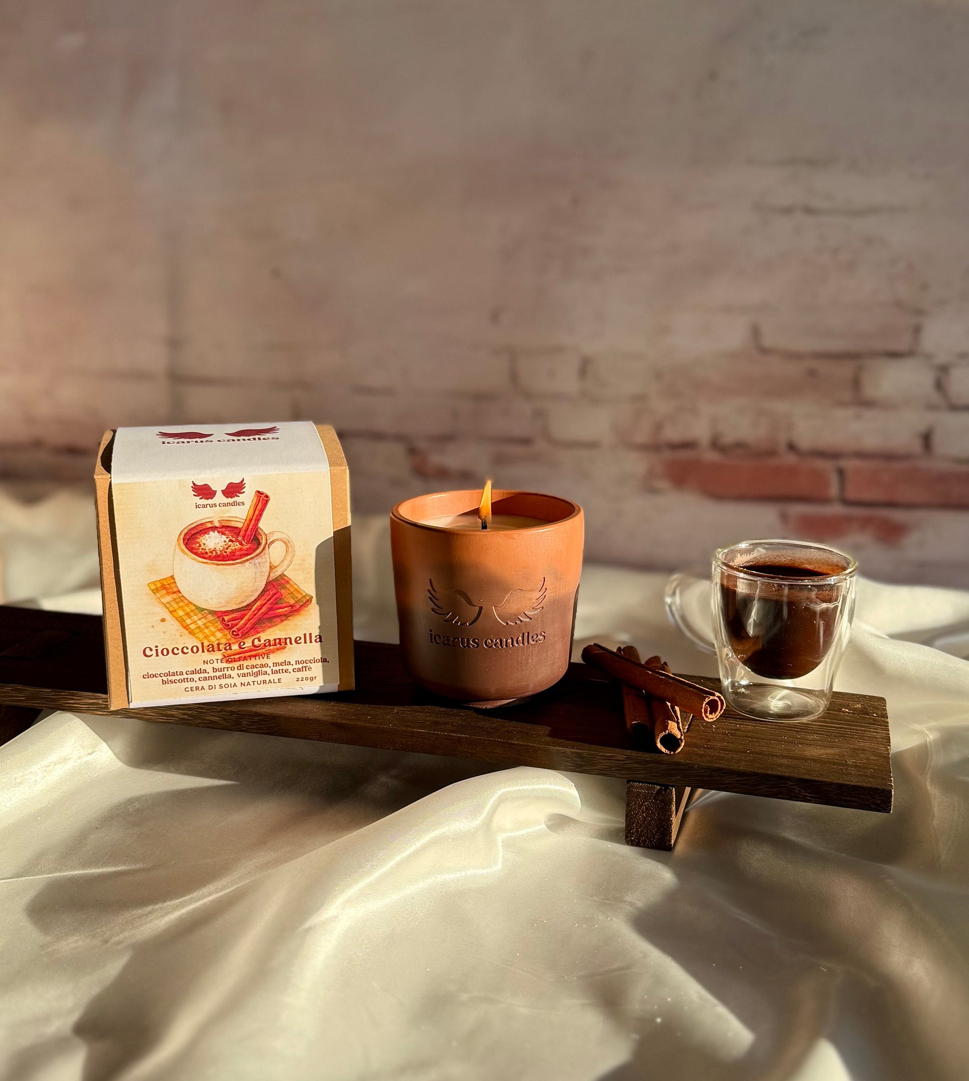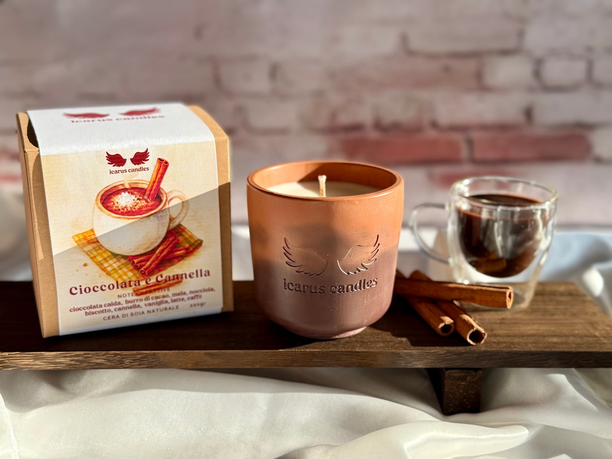 Un incontro avvolgente tra la dolcezza del cioccolato e il calore speziato della cannella. Questa candela artigianale in cera di soia naturale diffonde un aroma gourmand e accogliente, ideale per creare atmosfere intime e rilassanti. Perfetta nelle giornate fredde o per regalare un momento di puro comfort, trasforma ogni spazio in un rifugio caldo e profumato.