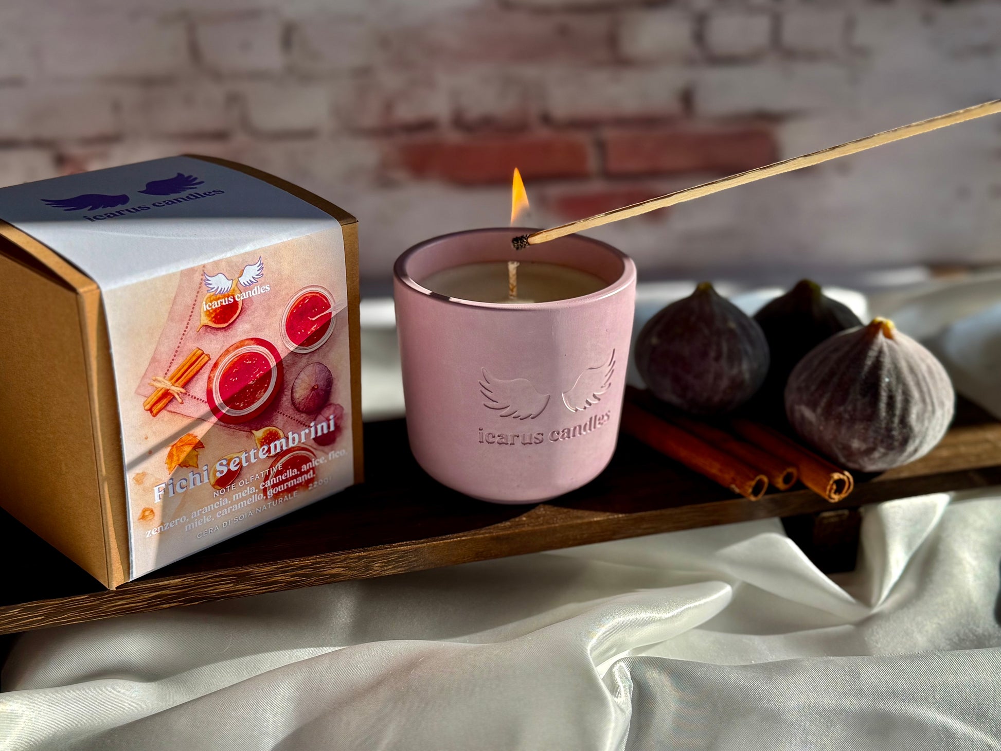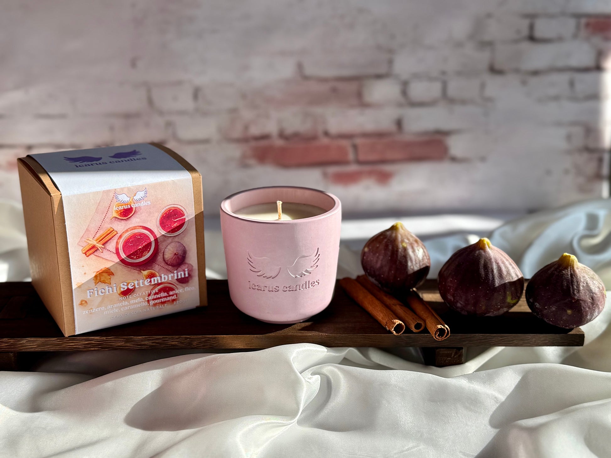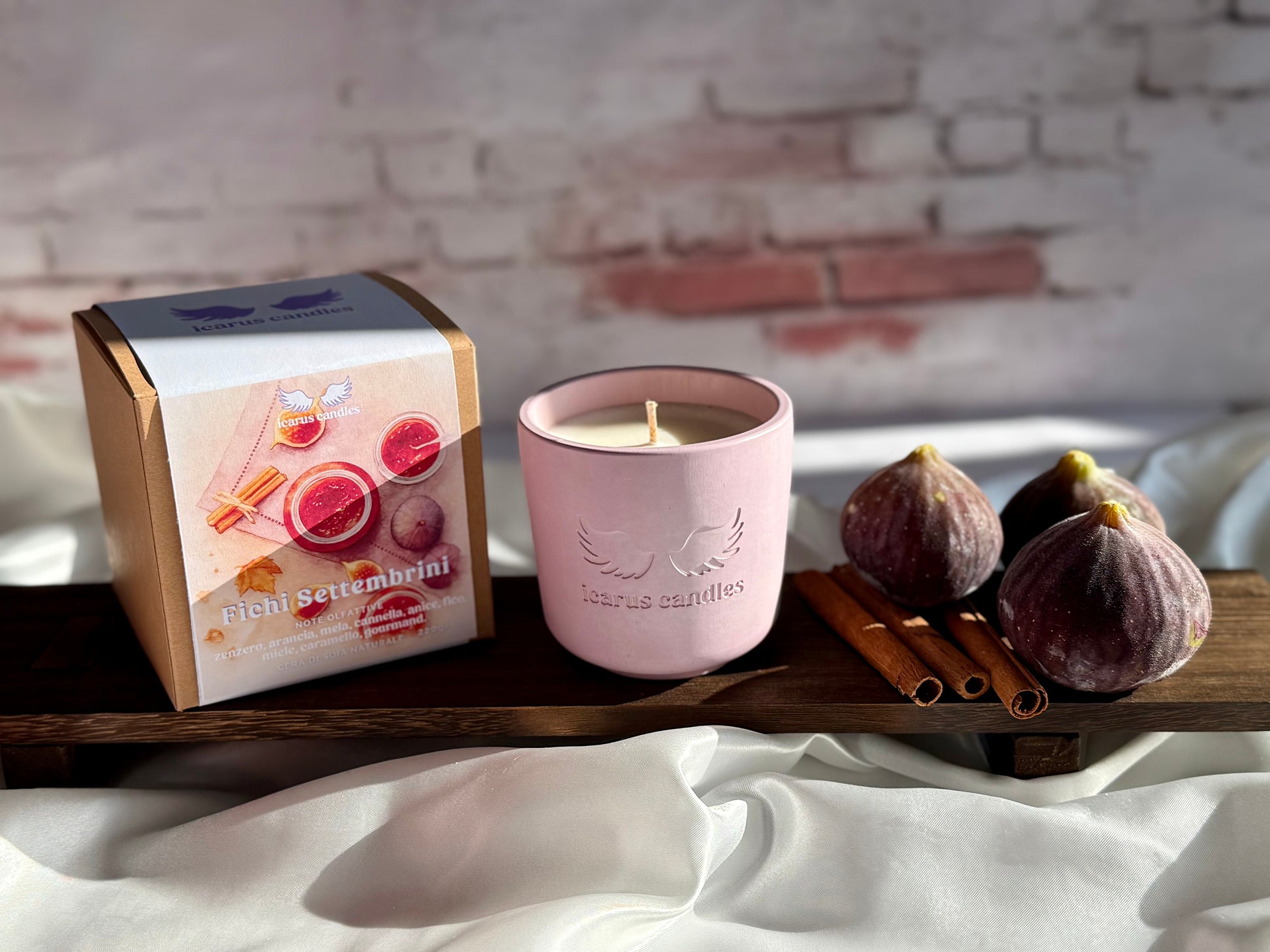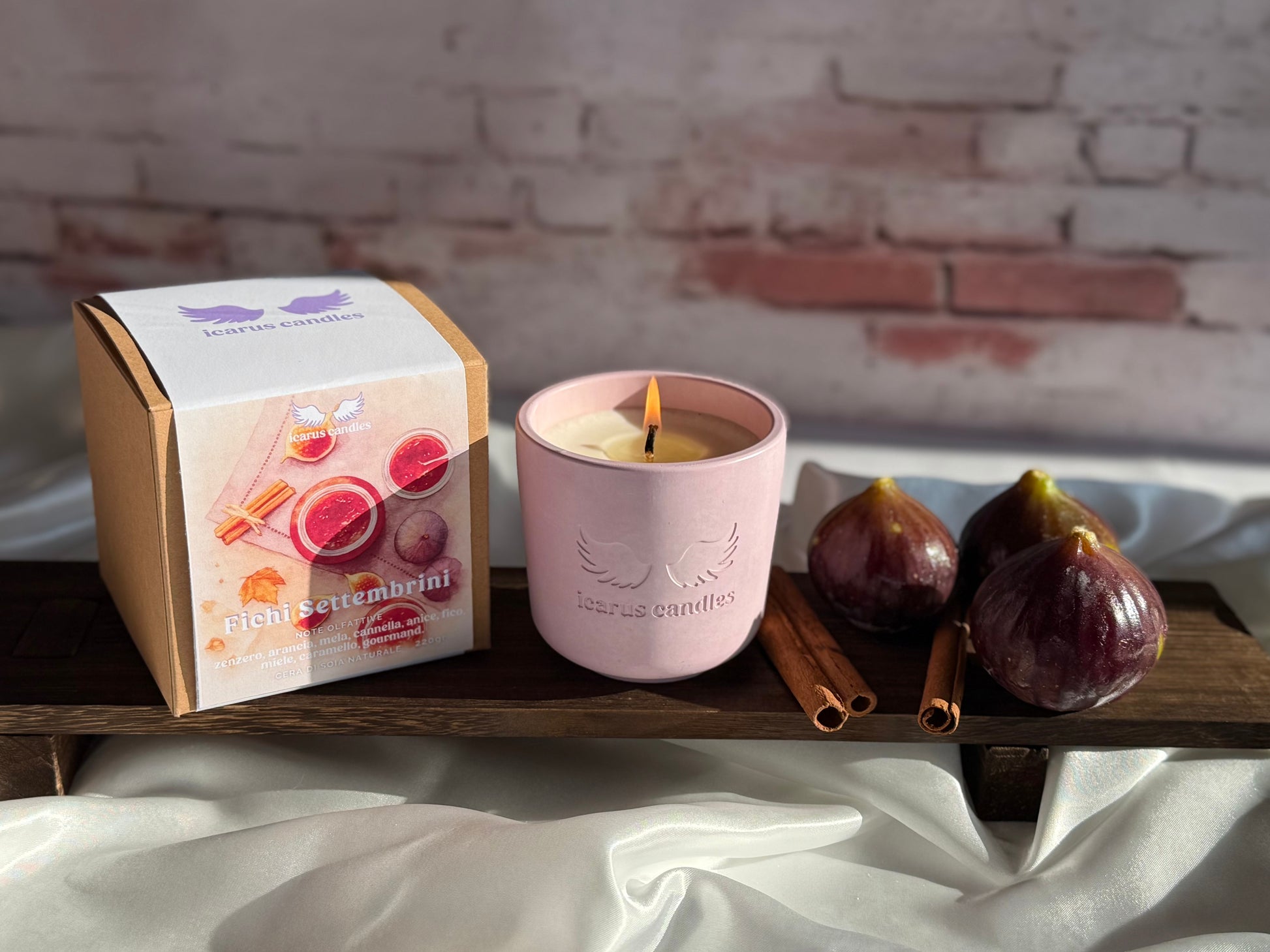 La Candela Artigianale "Fichi Settembrini" è una coccola profumata che sa di casa, di dolci in forno e pomeriggi d’autunno. La dolcezza vellutata del fico maturo si fonde con le note calde di zenzero e cannella, creando un’atmosfera intima e avvolgente. Perfetta per accompagnare i mesi più freddi, questa fragranza è l’ideale per riscaldare gli ambienti durante l’autunno e l’inverno.