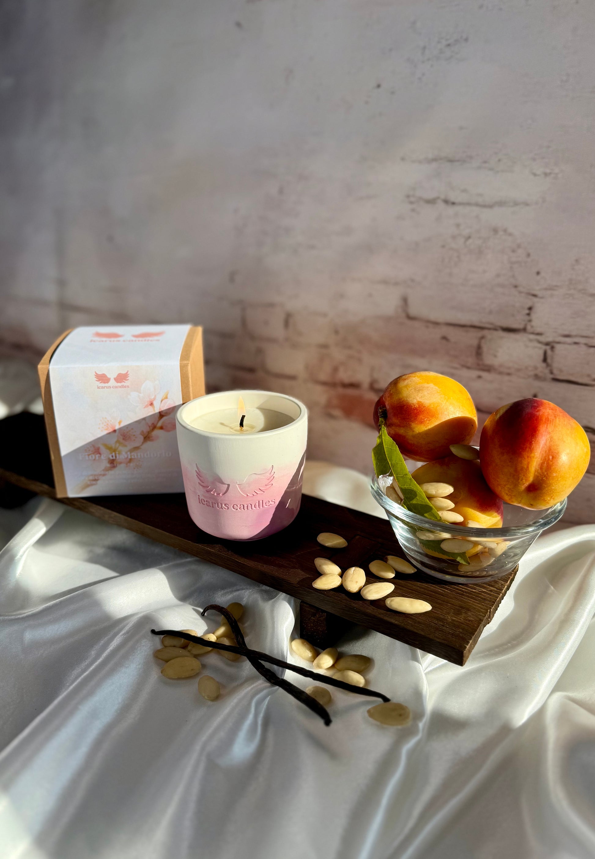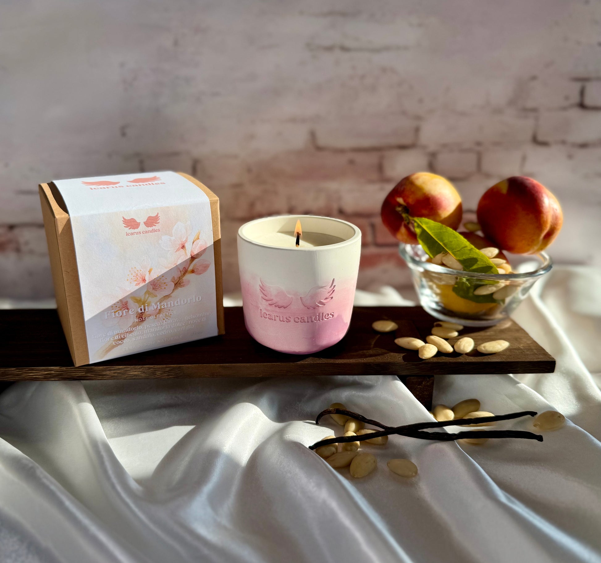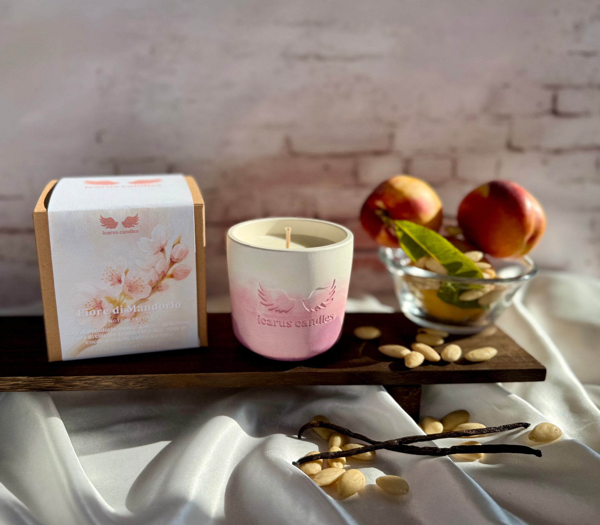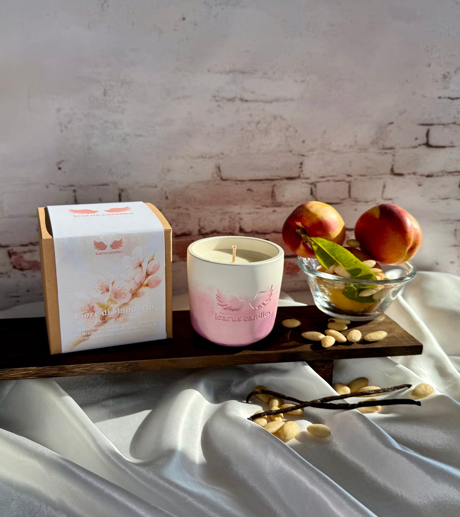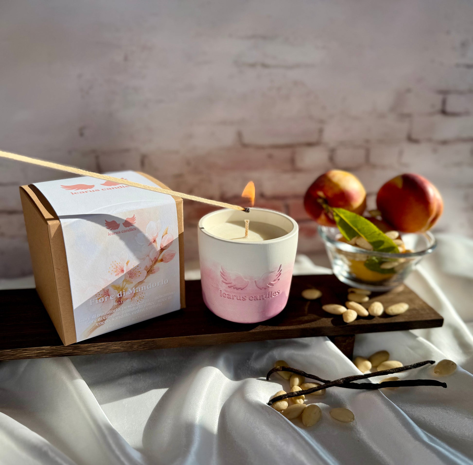 Immergiti in un'atmosfera primaverile con la candela "Fiore di Mandorlo". Note fresche e dolci di pesca e mandorla si uniscono a un cuore floreale di gelsomino e cocco, con un fondo caldo di sandalo, cedro e vaniglia. Perfetta per creare un’atmosfera rilassante e avvolgente.