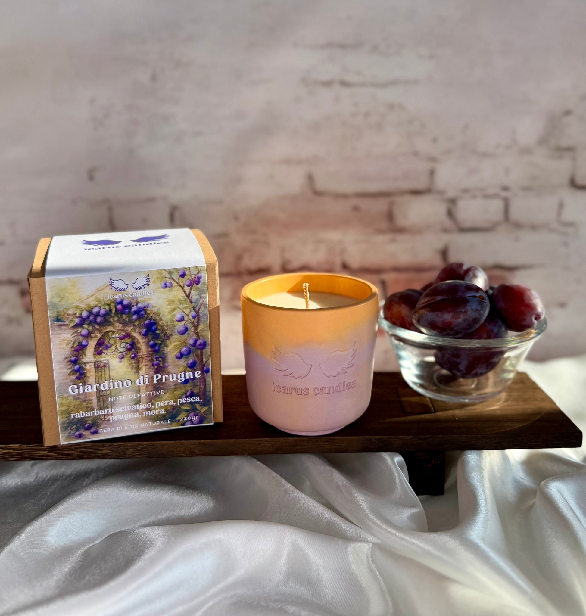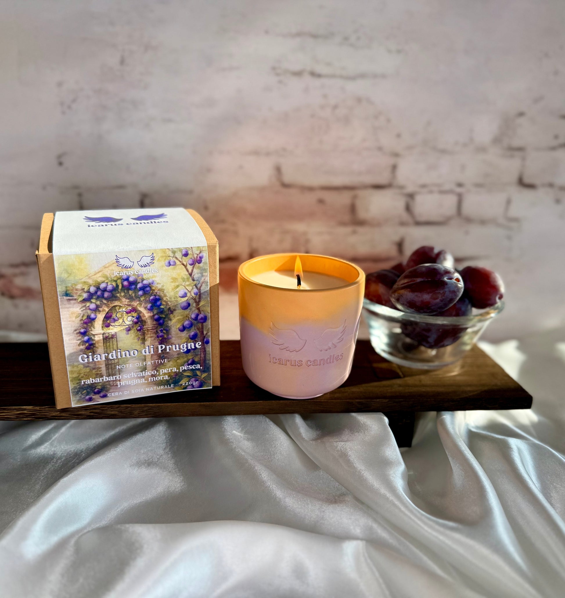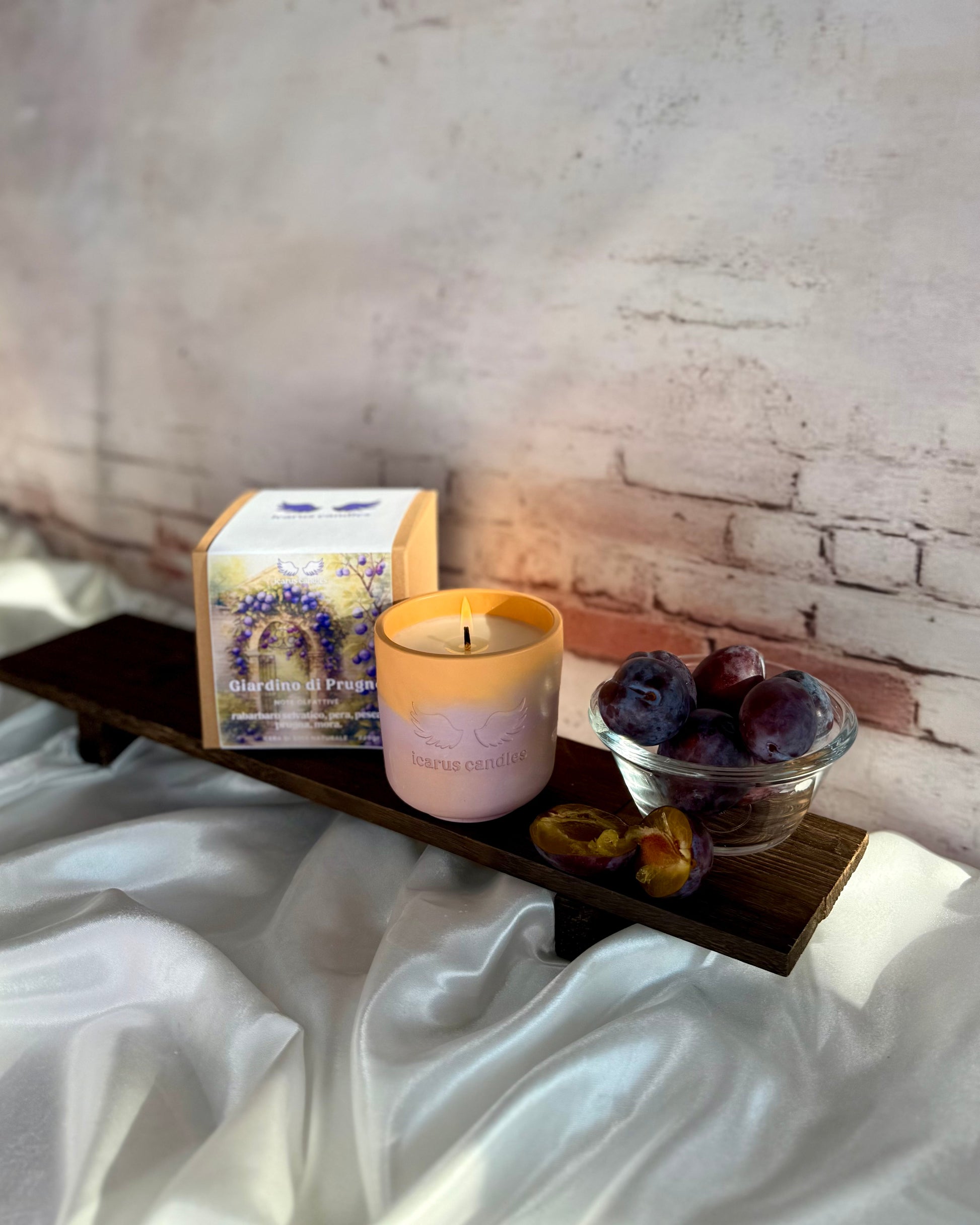 Accendi questa candela e lasciati trasportare in un giardino estivo, dove la dolcezza della prugna nera si fonde con la freschezza del rabarbaro. Le note fruttate e leggermente aspre di testa si armonizzano con un cuore di pesca e pera matura, mentre il fondo di prugna e mora completa la fragranza. Perfetta per creare un’atmosfera vivace, fruttata e accogliente in casa.