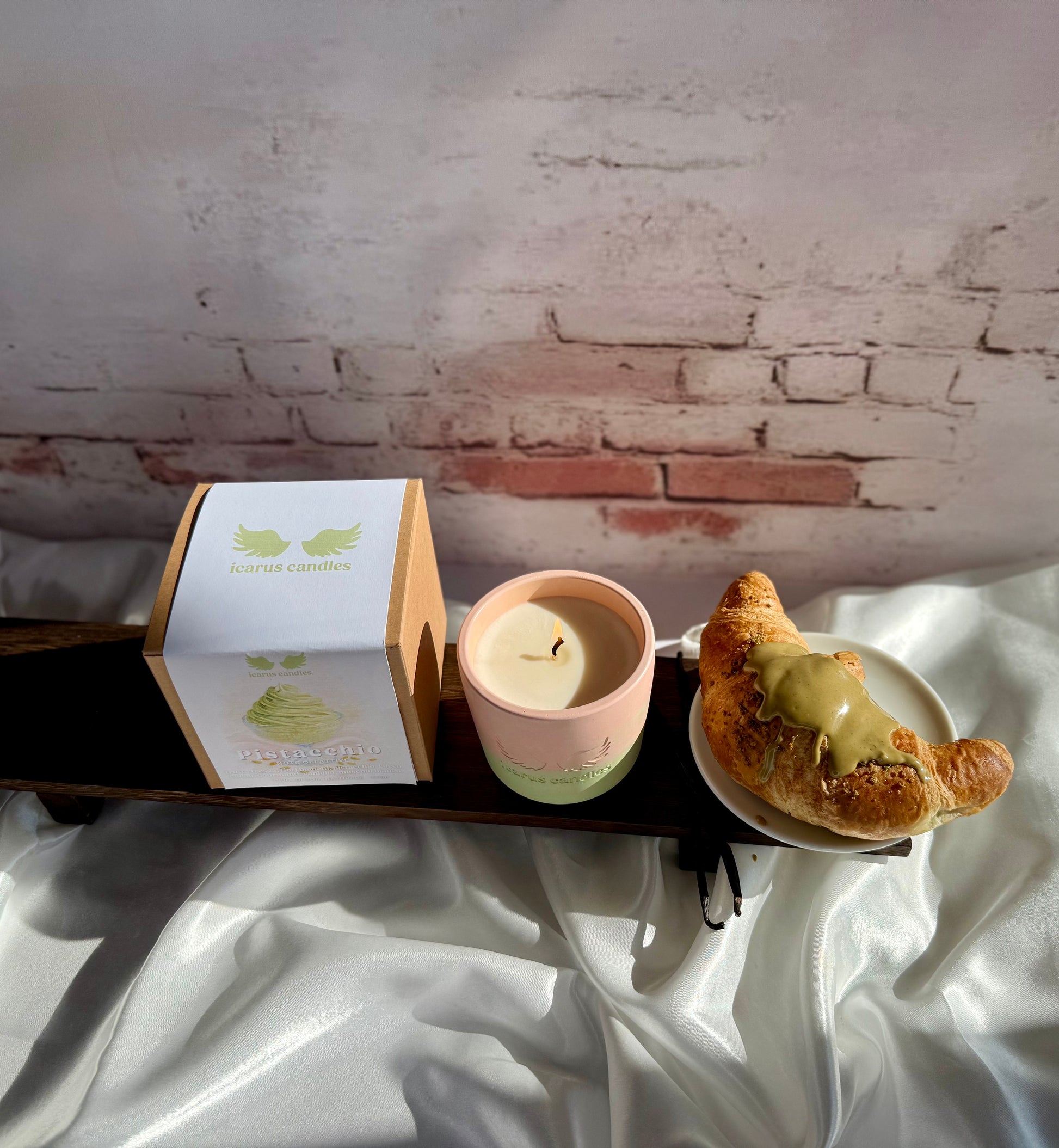 Lasciati avvolgere dal profumo intenso e goloso della candela "Pistacchio": una fusione cremosa di pistacchio, cacao e vaniglia che trasforma ogni ambiente in un piccolo angolo di dolcezza e calore. Perfetta per momenti di relax da gustare con tutti i sensi.